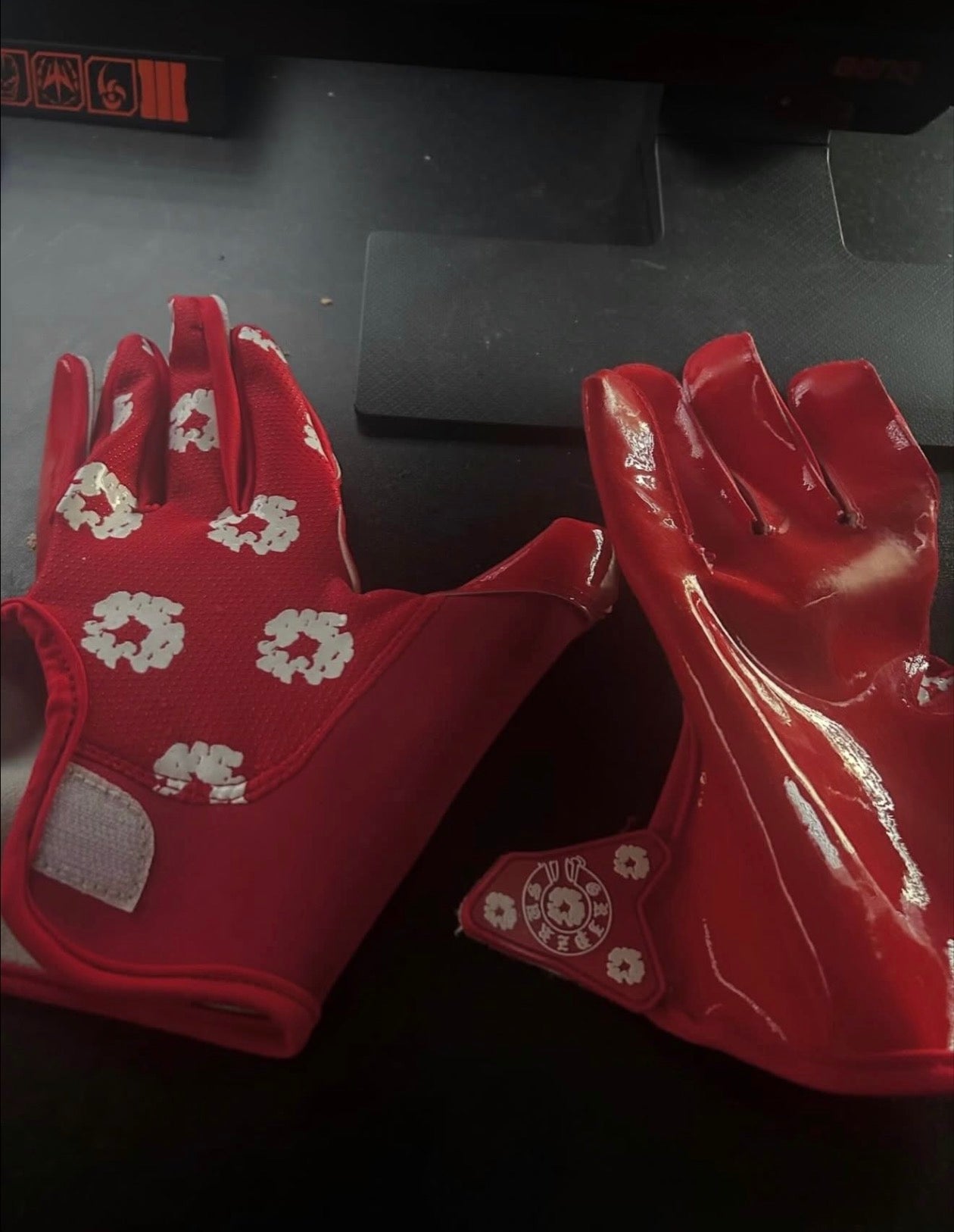Battle Sports “Denim tears” football receiver gloves in a red colorway